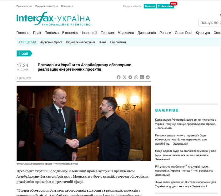 SİA xəbər verir ki, “Ukrinform” dövlət informasiya agentliyi, “İnterfaks-Ukrayna”, “RBK-Ukrayna”, “UNİAN”, “Cenzor”, “Gordon”, “Ukrainska Pravda”, “24tv.ua”, “Korrespondent” və digər informasiya agentlikləri, xəbər portallarında dərc edilən məqalələrdə Prezident İlham Əliyevin Azərbaycan və Ermənistan arasında paraflanmış sülh sazişinə, Rusiya tərəfindən Azərbaycanın Ukraynadakı enerji infrastrukturlarına, səfirliyinə hücumlarına dair fikirlərinə, Azərbaycan və Ukrayna prezidentləri arasında keçirilən görüş yer alıb.