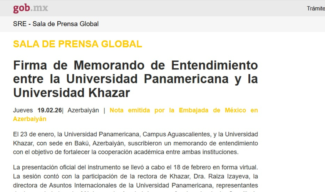 SİA xəbər verir ki, Meksika administrasiyasının “Gobierno de México” (gob.mx) rəsmi portalında bu barədə məlumat dərc olunub. Məlumatda bildirilir ki, sənədin təqdimatı onlayn formatda keçirilib. Tədbirdə Xəzər Universitetinin rektoru, professor Raziyə İsayeva, Panamerikana Universitetinin beynəlxalq əlaqələr üzrə direktoru, həmçinin Meksika və Azərbaycan səfirliklərinin nümayəndələri və Azərbaycan Xarici İşlər Nazirliyinin rəsmisi iştirak ediblər.