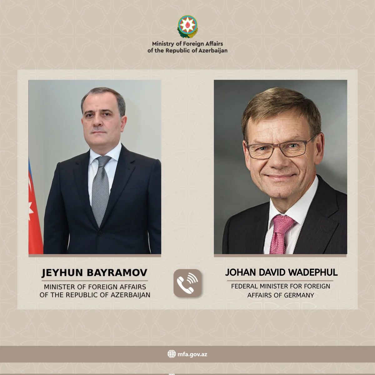 Almaniyanın xarici işlər naziri Yohan David Vadeful Azərbaycanın xarici işlər naziri Ceyhun Bayramova zəng vurub. SİA xəbər verir ki, Azərbaycan Xarici İşlər Nazirliyi məlumat yayıb.
