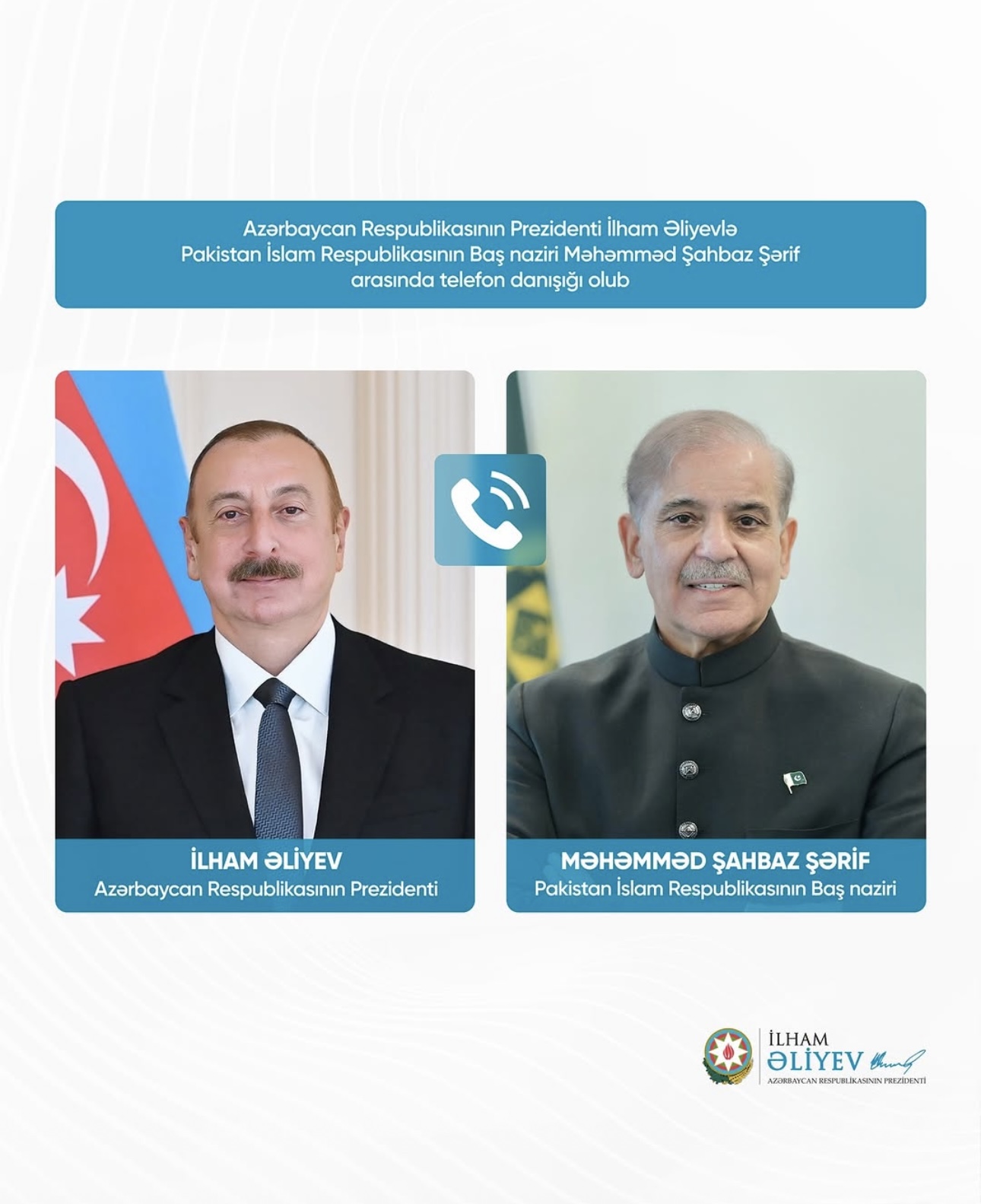 Azərbaycan Prezidenti İlham Əliyevlə Pakistan İslam Respublikasının Baş naziri Məhəmməd Şahbaz Şərif arasında martın 20-də telefon danışığı olub.