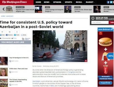 The Washington Times has issued an article headlined "Time for consistent U.S. policy toward Azerbaijan in a post-Soviet world".