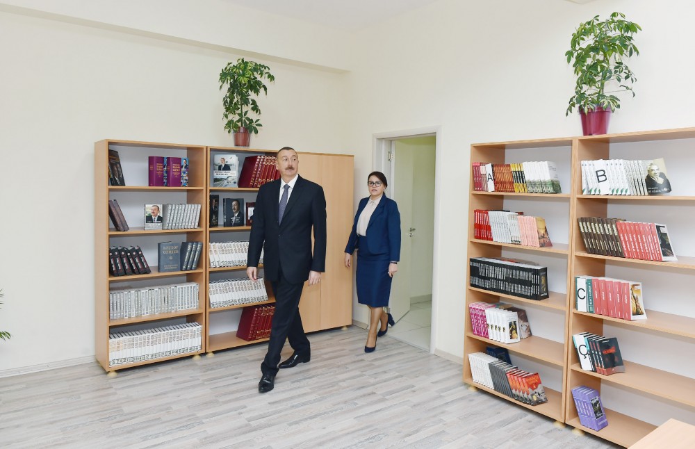 Dövlətimizin başçısı məktəbin rəmzi açılışını bildirən lenti kəsib, burada yaradılan şəraitlə tanış olub.
