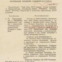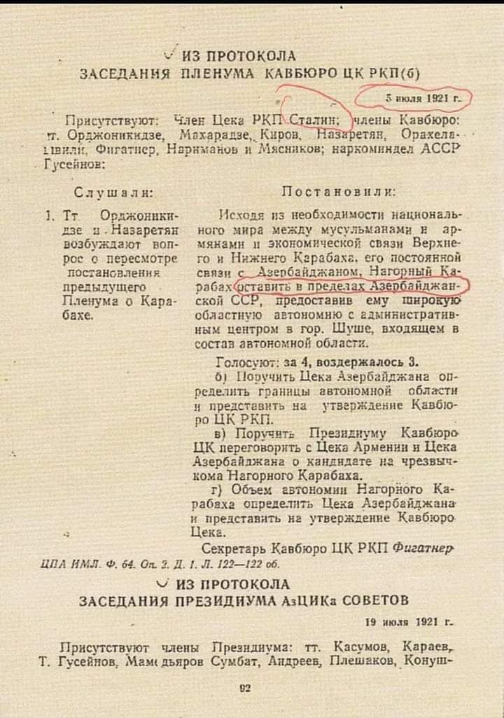 1. Siyasi Büro və Təşkilat Bürosu Dağlıq Qarabağın Azərbaycana şəksiz iqtisadi meylini nəzərə alaraq, Dağlıq Qarabağ haqqında məsələnin Bekzadyan tərəfindən qoyuluşunu qəbuledilməz sayır. Məsələ həmin mənada da həll olunmalıdır.