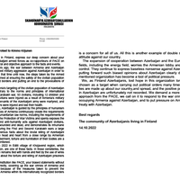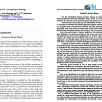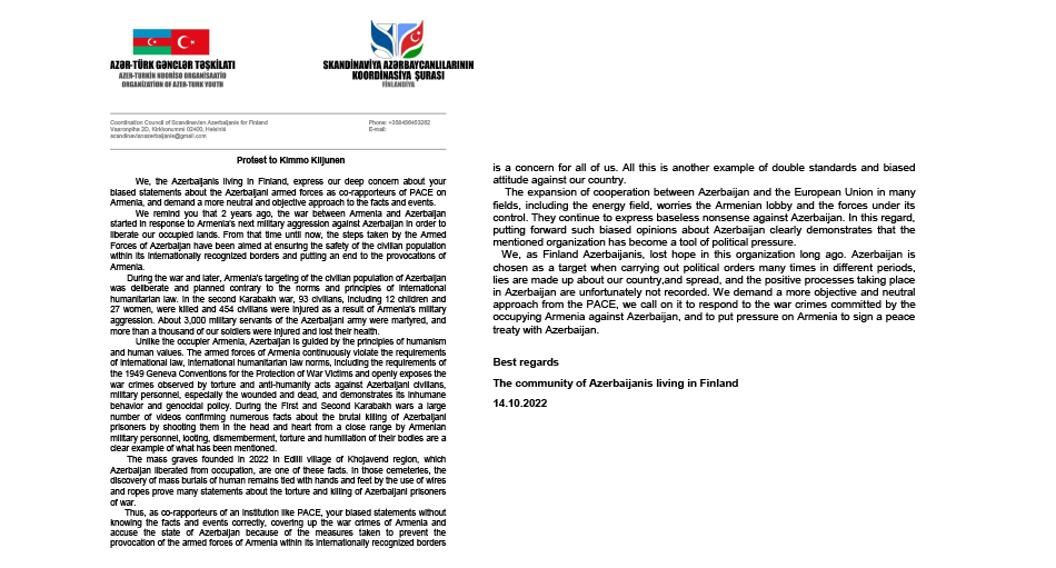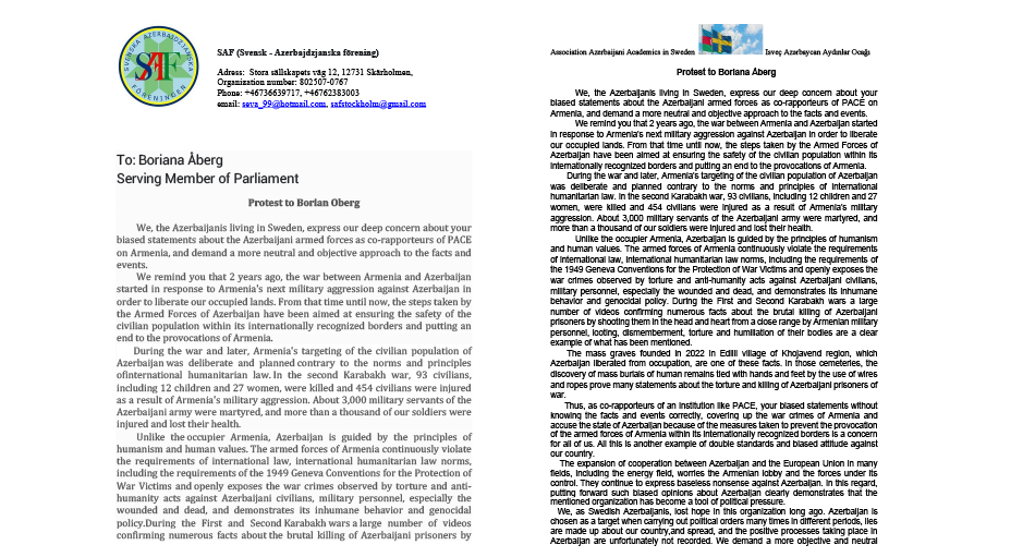 Müraciətdə bildirilib ki, AŞPA-nın Ermənistan üzrə həmməruzəçilərinin Azərbaycan Silahlı Qüvvələri ilə bağlı qərəzli bəyanatı İsveç və Finlandiya azərbaycanlılarında dərin narahatlıq doğurub. İsveç və Finlandiya azərbaycanlılarının öz deputatlarından faktlara və hadisələrə neytral və obyektiv yanaşma tələb etdiyi nəzərə çatdırılıb.