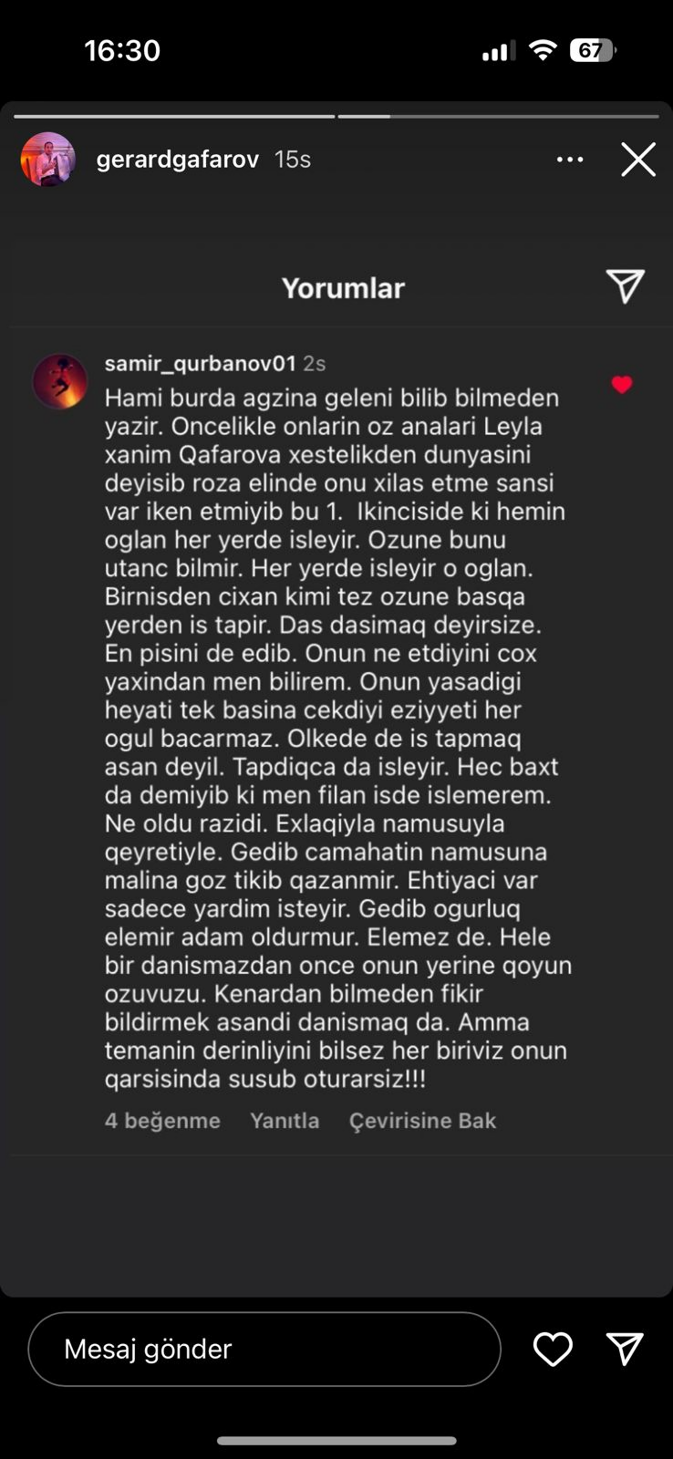 Jerardın dostu olduğu güman edilən Samir Qurbanovun verdiyi açıqlamalar isə şok effekti yaradıb. O, Roza Zərgəlinin vaxtilə Jerardın xəstə anasına yardım etmədiyini iddia edib: “Hamı bilib-bilmədən ağzına gələni yazır. Öncəliklə onların öz anaları Leyla xanım Qafarova xəstəlikdən dünyasını dəyişib. Roza əlində onu xilas etmək şansı var ikən bunu etməyib. İkincisi həmin oğlan hər yerdə işləyir, özünə bunu utanc bilmir. Bir işdən çıxan kimi başqa iş tapır. Siz daş daşımaq deyirsiniz, o, ən pisini də edib.Onun nə etdiyini çox yaxından mən bilirəm. Onun yaşadığı həyatı, təkbaşına çəkdiyi əziyyətləri hər oğul bacarmaz!