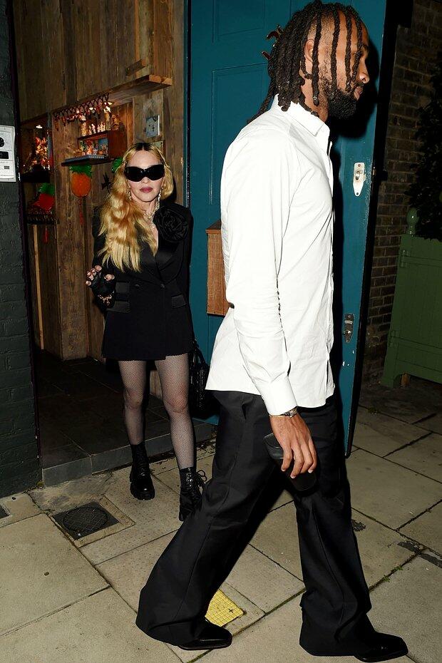 Paparatsilər 66 yaşlı müğənnini 28 yaşlı futbolçu Akeem Morrislə birlikdə Londonda səsyazma studiyasında yaxalayıb. Madonna geyim üçün qara rəngli mini-uzun pencək paltarı seçib, görünüşünü balıq torları, gün eynəyi, qısa əlcəklər və kobud çəkmələrlə tamamlayıb. Eyni zamanda əlində tünd dəri çanta da var. Bundan əlavə, Madonna çoxlu zinət əşyaları, o cümlədən bir neçə boyunbağı və böyük sırğalar taxıb. Eyni zamanda saçlarını açıq buraxıb, çılpaq çalarlarda makiyaja üstünlük verib.