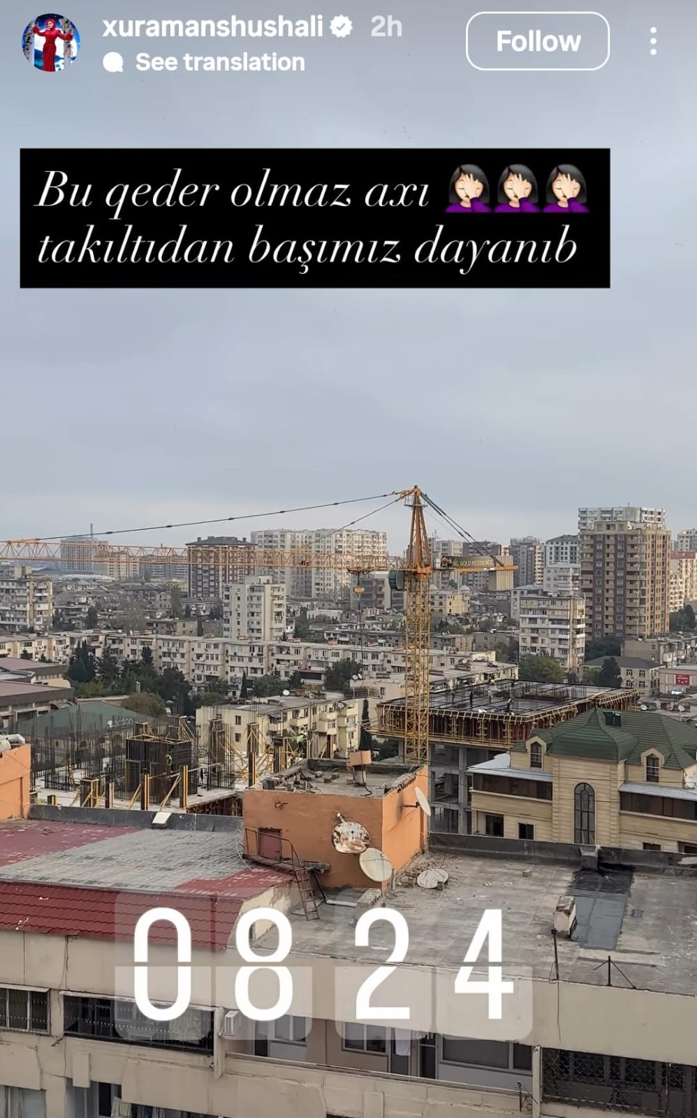 Müğənni Xuraman Şuşalı yaşadığı ərazidə gecə saatlarında tikinti işləri aparılmasından şikayətlənib. SİA xəbər verir ki, bu barədə o, sosial şəbəkədə paylaşım edib. O, gecə-gündüz davam edən tikintiyə görə rahatlıq tapa bilmədiklərini qeyd edib: "Bir saatdır ki, takka-tukdur. Gecə də dayanmırlar. Yaxın binada yaşayanlar nə edir görəsən? Biz hələ tikintidən iki bina aralıdayıq. Artıq ölürük, belə olmaz axı. Heç olmazsa, şənbə və bazar günləri işləməyin. Gecə və gündüz dayanmadan işləyirlər. İnsanların haqqına bu qədər girmək olmaz axı".