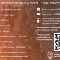Qeyd olunub ki, fevralın 6-da baş verən dağıdıcı zəlzələdən sonra Azərbaycan Türkiyəyə 867 nəfər xilasetmə və tibbi personal, 2 mobil səhra hospitalı, 4873 çadır, 4 səhra mətbəxi, 861 generator, 221 512 zəruri ləvazimatlar və məhsullar, 302 034 isti geyim, 693 756 ədəd dərman və tibb ləvazimatlar göndərilib.