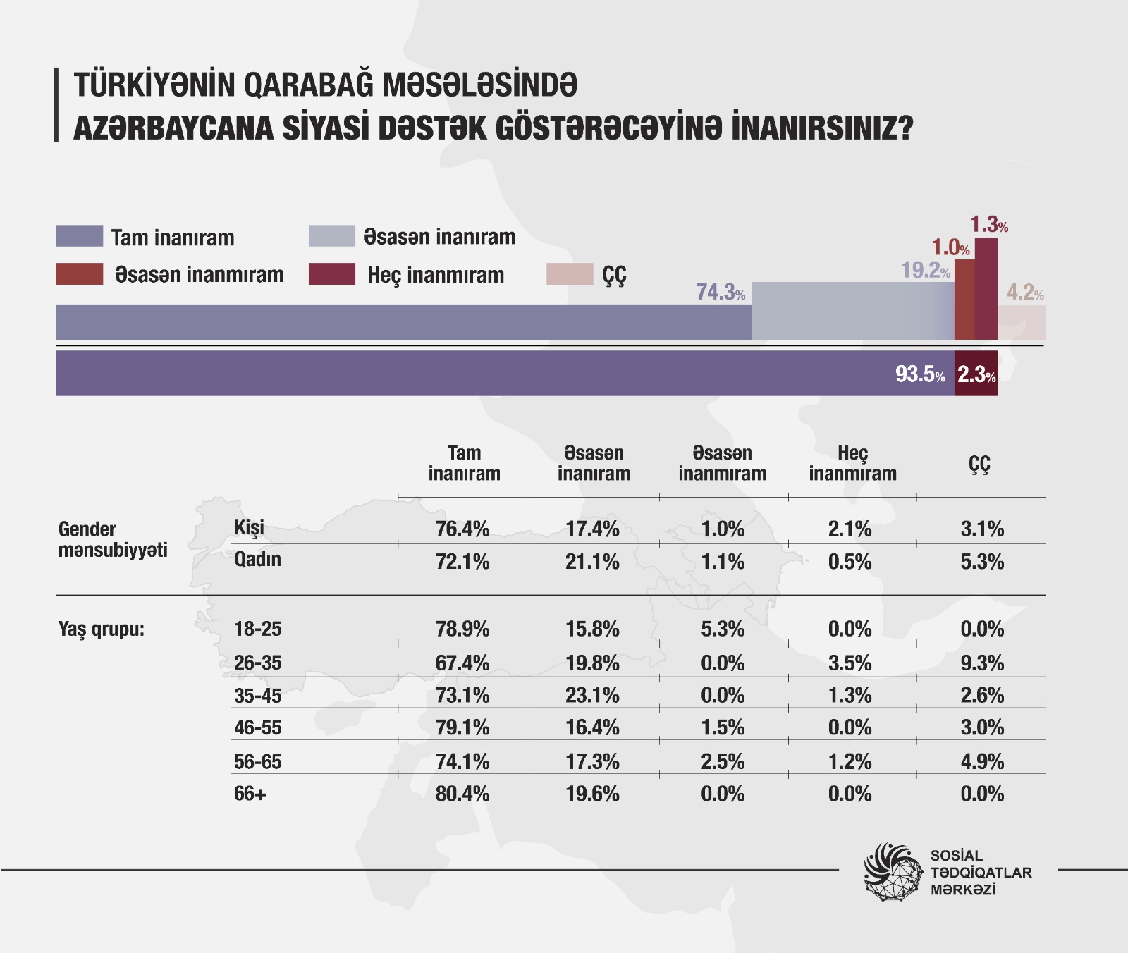 Daha detallı təhlil etsək, Türkiyənin Qarabağ məsələsində Azərbaycana siyasi dəstək göstərəcəyinə sorğu iştirakçılarının böyük hissəsi – 74,3%-i tam, 19,2%-i əsasən inandığını qeyd edib.
