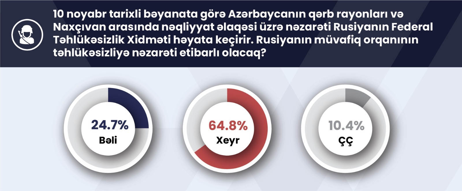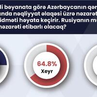 Respondentlərin 64,8%-nin mövqeyinə görə, Rusiyanın müvafiq orqanının təhlükəsizliyə nəzarəti etibarlı olmayacaq. Onların 24,7%-i bu mövqedədir ki, Rusiyanın müvafiq orqanının təhlükəsizliyə nəzarəti etibarlı olacaq. 10,4%-i bu barədə fikir bildirməkdə çətinlik çəkib.