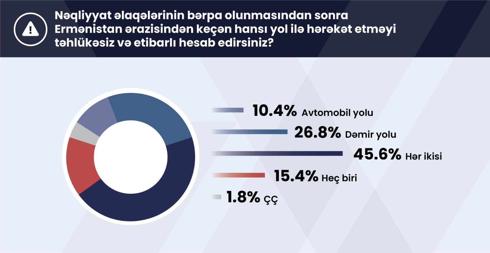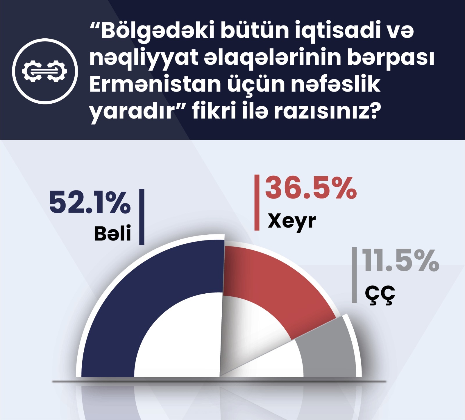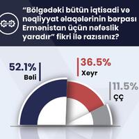 Respondentlərin 52,1%-i bu mövqedədir ki, bölgədəki bütün iqtisadi və nəqliyyat əlaqələrinin bərpası Ermənistan üçün nəfəslik yaradır. Onların 36,5%-i bu fikirlə razılaşmadığını qeyd edib, 11,5%-i fikir bildirməkdə çətinlik çəkib.