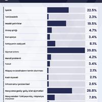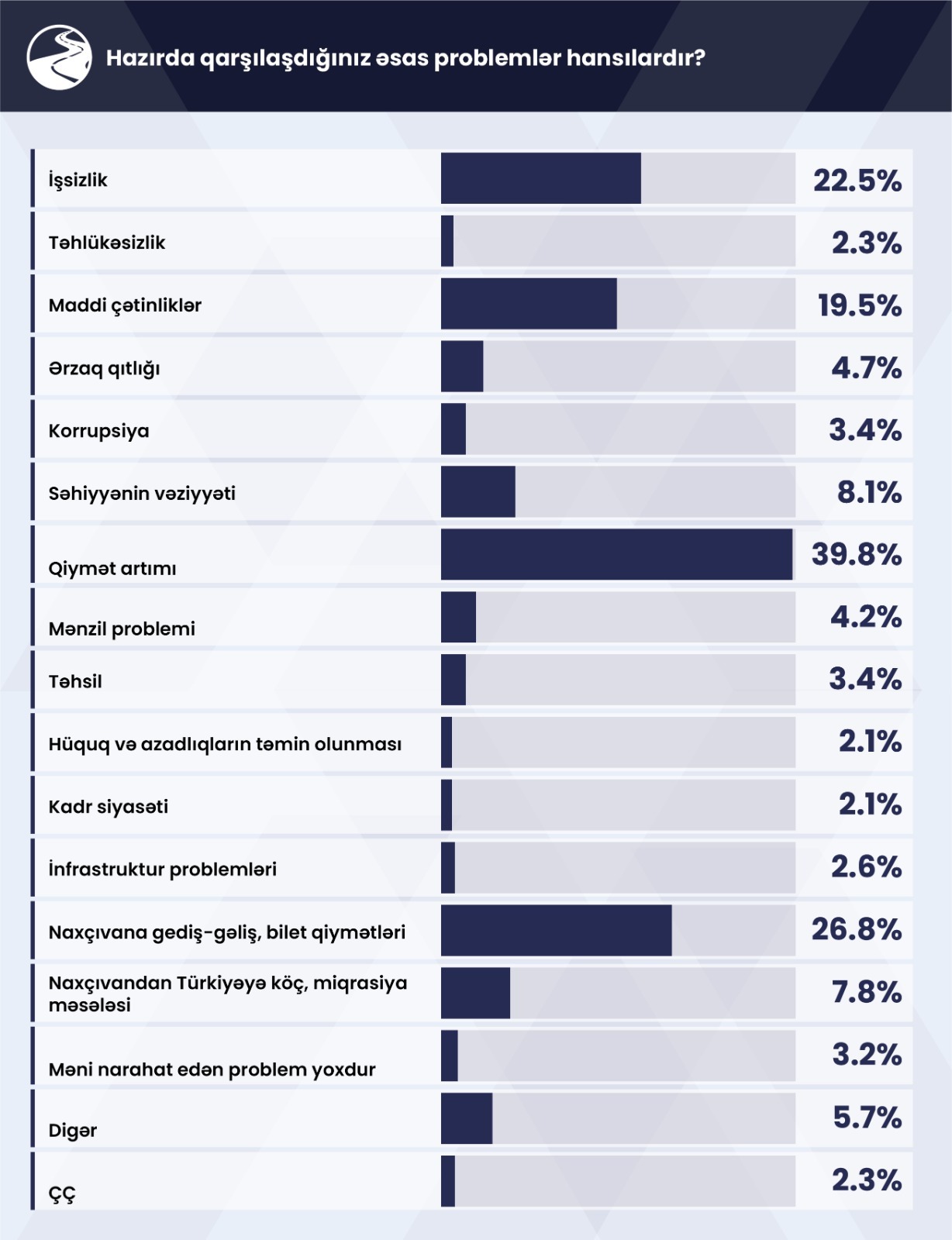 Respondentlərin əsas hissəsi, yəni 39,8%-i qiymət artımı problemini, 26,8%-i Naxçıvana gediş-gəliş xərcinin, bilet qiymətlərinin yüksək olmasını əsas problem kimi qeyd edib. Respondentlərin 22,5%-i işsizliyin, 19,5%-i qarşılaşdığı maddi çətinliklərin əsas problem olduğunu vurğulayıb. Respondentlərin 8,1%-i səhiyyənin vəziyyətini, 7,8%-i Naxçıvandan Türkiyəyə köç və miqrasiya problemlərini, 5,7%-i digər problemləri diqqətə çatdırıb. Respondentlərin 3,2%-i onu narahat hər hansı problemin olmadığını qeyd edib, 2,3%-i cavab verməkdə çətinlik çəkib.