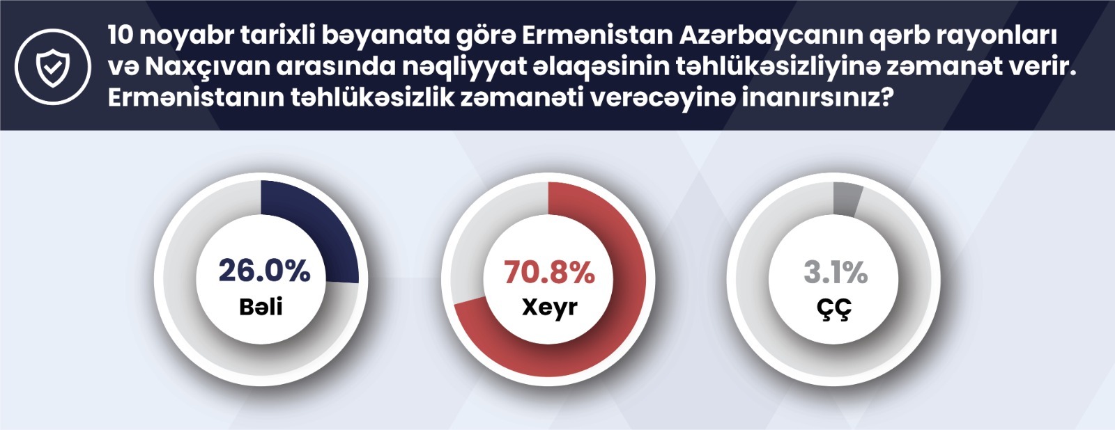 Respondentlərin 70,8%-i Ermənistanın təhlükəsizlik zəmanəti verəcəyinə inanmadığını ifadə edib. Onların 26,0%-i Ermənistanın təhlükəsizlik zəmanəti verəcəyinə inandığını bildirib.