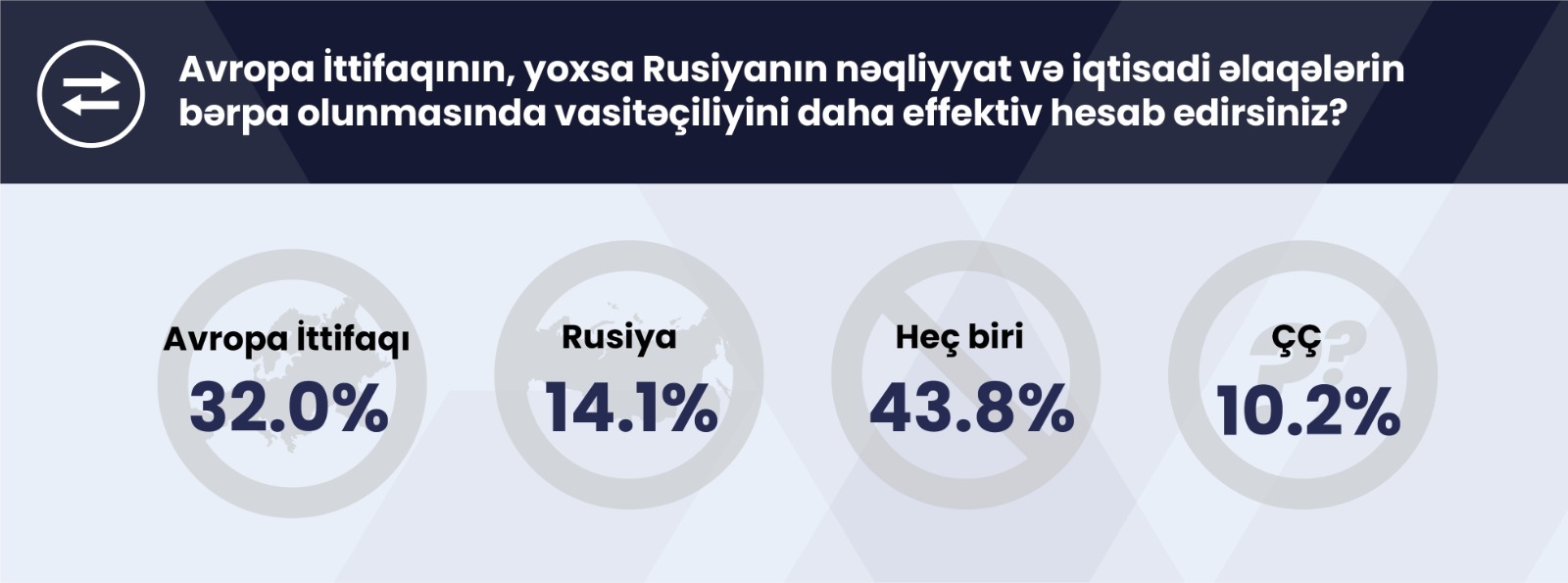 Sorğuda iştirak edənlərin 43,8%-i nə Avropa İttifaqının, nə də Rusiyanın nəqliyyat və iqtisadi əlaqələrin bərpa olunmasında vasitəçiliyini effektiv hesab edib. Respondentlərin 32,0%-i yalnız Avropa İttifaqının, 14,1%-i yalnız Rusiyanın vasitəçiliyinin daha effektiv olduğu qənaətindədir.