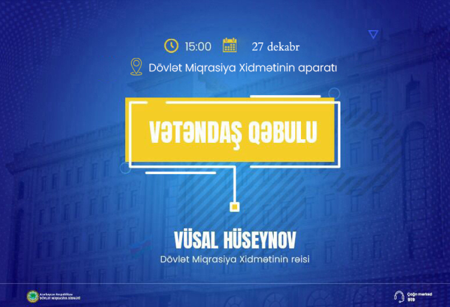 Dövlət Miqrasiya Xidmətinin rəisi Vüsal Hüseynov dekabrın 27-si saat 15:00-da Xidmətin aparatında vətəndaşlarla görüşəcək. Xidmətdən SİA-ya bildirilib ki, qəbulda iştirak etmək istəyənlər şəxsiyyətini təsdiq edən sənədlərlə dekabrın 26-dək Bakı şəhəri, Atatürk prospekti 189 ünvanında yerləşən Bakı şəhər regional miqrasiya baş idarəsinə yaxınlaşaraq qeydiyyatdan keçə bilərlər.