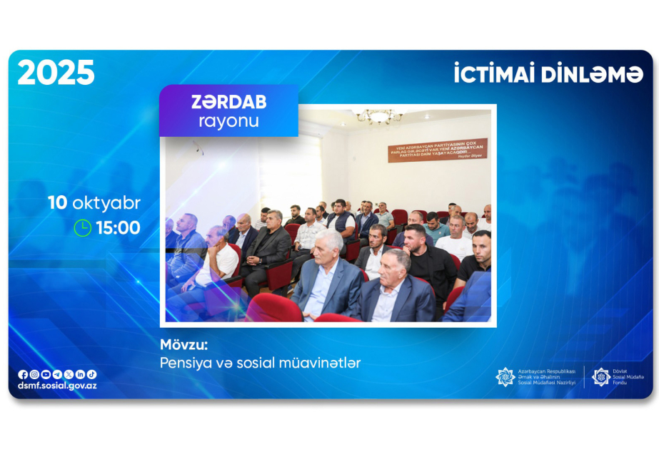 Əmək və Əhalinin Sosial Müdafiəsi Nazirliyinin tabeliyində Dövlət Sosial Müdafiə Fondu (DSMF) oktyabrın 10-u saat 15:00-da Zərdab rayonunda ictimaiyyət nümayəndələrinin iştirakı ilə pensiya və sosial müavinətlərə dair ictimai dinləmə keçirəcək. Fondun mətbuat xidmətindən SİA-ya verilən məlumata görə, ictimai dinləmədə iştirak etmək istəyənlər DSMF-nin Zərdabda yerləşən qəbul şöbəsinə, eləcə də fondun sosial şəbəkə hesabları vasitəsilə müraciət edib, qeydiyyatdan keçə bilərlər.