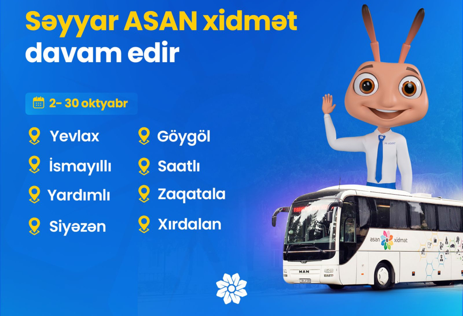 Bu gündən Yevlax, İsmayıllı, Yardımlı, Siyəzən, Göygöl, Saatlı, Zaqatala və Xırdalanda vətəndaşlara səyyar xidmətin göstərilməsinə başlanılıb. Azərbaycan Respublikasının Prezidenti yanında Vətəndaşlara Xidmət və Sosial İnnovasiyalar üzrə Dövlət Agentliyinin İctimaiyyətlə əlaqələr şöbəsindən SİA-ya verilən məlumata görə, səyyar ASAN xidmətin həyata keçirilməsinin əsas məqsədləri dövlət xidmətlərinin vətəndaşlara daha rahat, yeni və innovativ üsullarla təqdim olunması, vətəndaşlar üçün əlçatanlığın təmin edilməsi və vətəndaş məmnunluğuna nail olunmasıdır.