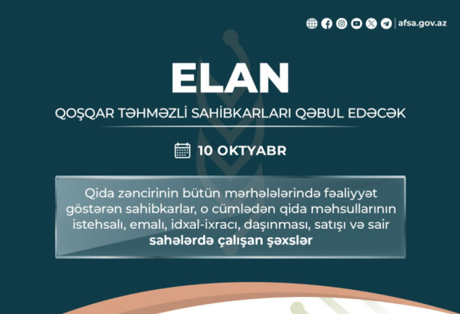 Bildirilib ki, qida zəncirinin bütün mərhələlərində fəaliyyət göstərən sahibkarlar, o cümlədən qida məhsullarının istehsalı, emalı, idxal-ixracı, daşınması, satışı və sair sahələrdə çalışan şəxslər onları narahat edən məsələlərlə bağlı agentlik sədri ilə görüşə bilərlər.