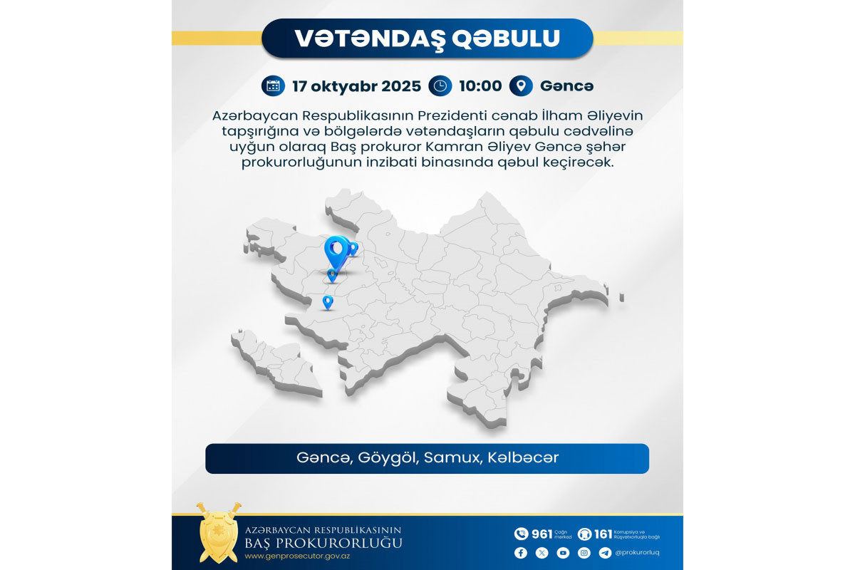 Baş prokuror Kamran Əliyev oktyabrın 17-də Gəncə şəhər prokurorluğunun inzibati binasında Gəncə şəhər, Göygöl, Samux və Kəlbəcər rayon sakinlərinin qəbulunu keçirəcək. Bu barədə SİA-ya baş Prokurorluğun mətbuat xidmətindən məlumat verilib.