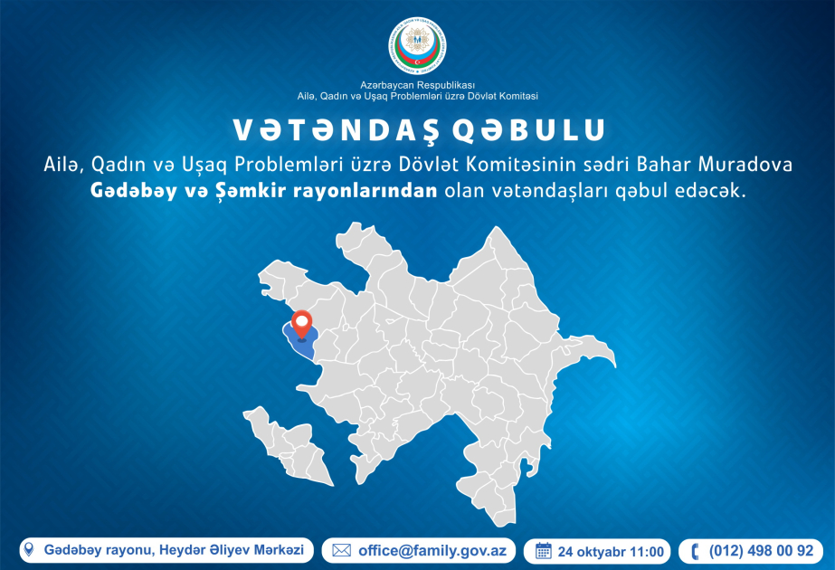 Ailə, Qadın və Uşaq Problemləri üzrə Dövlət Komitəsinin sədri Bahar Muradova oktyabrın 24-də saat 11:00-da Gədəbəy rayon Heydər Əliyev Mərkəzində vətəndaşlarla görüş keçirəcək. Komitədən SİA-ya bildirilib ki, görüş zamanı Gədəbəy və Şəmkir rayonlarının sakinlərinin müraciətləri dinləniləcək, onların qaldırdıqları məsələlərin həlli istiqamətində müvafiq tədbirlər görüləcək.