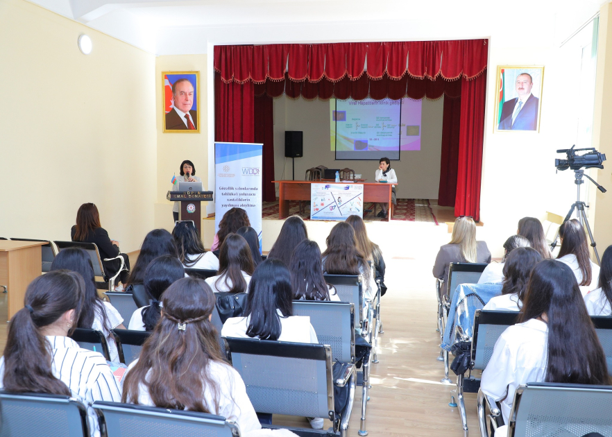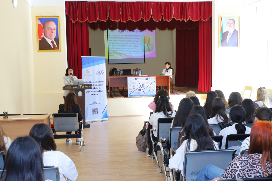“İnkişafa Doğru Qadın Təşəbbüsü” İctimai Birliyi Azərbaycan Respublikasının Qeyri-Hökumət Təşkilatlarına Dövlət Dəstəyi Agentliyinin maliyyə yardımı ilə həyata keçirdiyi “Gözəllik salonlarında təhlükəli yoluxucu xəstəliklərin yayılması əleyhinə təlimlər” adlı layihə çərçivəsində növbəti maarifləndirici tədbirini təşkil edib. İctimai Birlikdən SİA-ya bildirilib ki, “Gözəl ol və sağlam qal!” devizi altında keçirilən təlim Emal Sənayesi üzrə Bakı Dövlət Peşə Təhsil Mərkəzində baş tutub.Tədbir Azərbaycanın Dövlət Himninin səsləndirilməsi və Vətən müharibəsi şəhidlərinin xatirəsinin bir dəqiqəlik sükutla yad edilməsi ilə başlayıb.