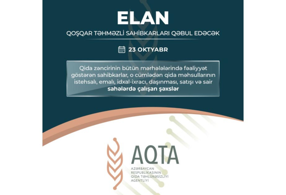 Azərbaycan Qida Təhlükəsizliyi Agentliyinin (AQTA) sədri Qoşqar Təhməzli oktyabrın 23-ü saat 14:00-da qida sahəsində fəaliyyət göstərən sahibkarlarla görüşəcək. Agentliyin İnformasiya təminatı və innovativ həllər şöbəsindən SİA-ya verilən məlumata görə, qida zəncirinin bütün mərhələlərində fəaliyyət göstərən sahibkarlar, o cümlədən qida məhsullarının istehsalı, emalı, idxal-ixracı, daşınması, satışı və sair sahələrdə çalışanlar onları narahat edən məsələlərlə bağlı agentlik sədri ilə görüşə bilərlər.
