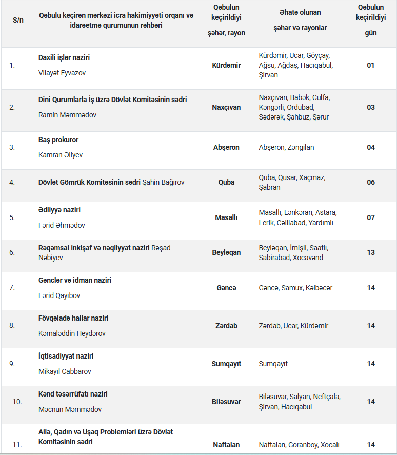 Mərkəzi icra hakimiyyəti orqanlarının və digər idarəetmə qurumlarının rəhbərləri tərəfindən 2025-ci ilin noyabr ayında şəhər və rayonlarda keçiriləcək vətəndaşların qəbulu cədvəli açıqlanıb. SİA xəbər verir ki, vətəndaşların qəbulu müəyyən edilmiş günlərdə saat 10:00-da başlayır.
