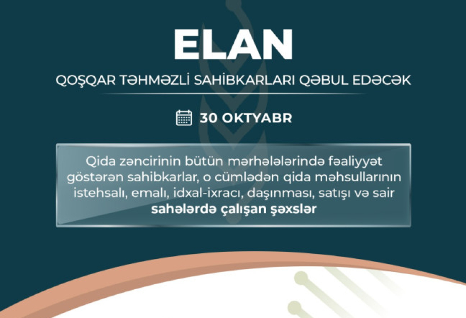 Azərbaycan Qida Təhlükəsizliyi Agentliyinin (AQTA) sədri Qoşqar Təhməzli oktyabrın 30-u saat 14:00-da agentliyin inzibati binasında qida sahəsində fəaliyyət göstərən sahibkarlarla görüşəcək. AQTA-nın İnformasiya təminatı və innovativ həllər şöbəsindən SİA-ya verilən məlumata görə, qida zəncirinin bütün mərhələlərində fəaliyyət göstərən sahibkarlar, o cümlədən qida məhsullarının istehsalı, emalı, idxal-ixracı, daşınması, satışı və digər sahələrdə çalışan şəxslər onları narahat edən məsələlərlə bağlı agentlik sədri ilə görüşə bilərlər.
