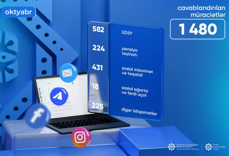Dövlət Sosial Müdafiə Fondunun fəaliyyət istiqamətləri üzrə sosial şəbəkələr vasitəsilə oktyabr ayı ərzində 1480 vətəndaş müraciəti cavablandırılıb. Bu barədə SİA-ya fondun mətbuat xidmətindən məlumat verilib.