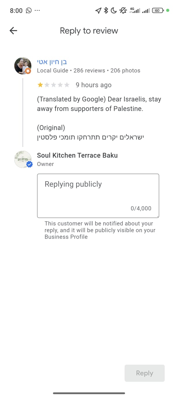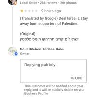 Buna baxmayaraq, "Soul Kitchen Terrace Baku" öz mövqeyində qalır və menyuda Ərəb dili bölməsi Fələstin bayrağı ilə təqdim edilməyə davam edir. Restoranın bu addımı Fələstin xalqına mənəvi dəstək kimi qiymətləndirilib.
