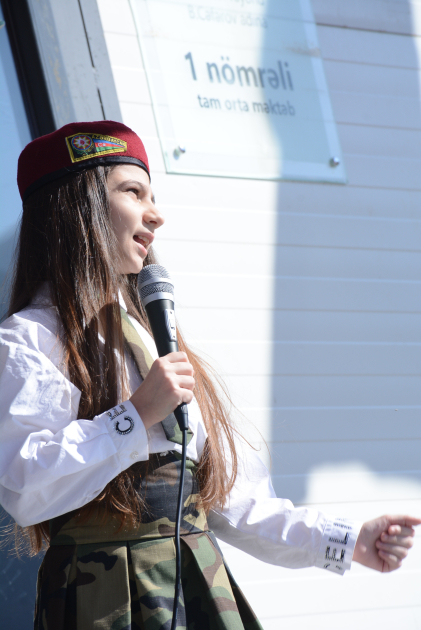 Məktəbin direktoru Vəsilə Cəfərova çıxış edərək xalqımızın Böyük Zəfərinə gedən yoldan, Ali Baş Komandanın rəhbərliyi altında qazanılan qələbənin tarixi əhəmiyyətindən və qəhrəman əsgər və zabitlərimizin misilsiz igidliyindən bəhs edib.