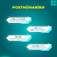 • müharibə ilə əlaqədar əlilliyi olan 2 min 389 şəxs 84 min reabilitasiya vasitəsi, o cümlədən 496 şəxs 618 ədəd yüksək texnologiyalı müasir protezlə təmin olunub;