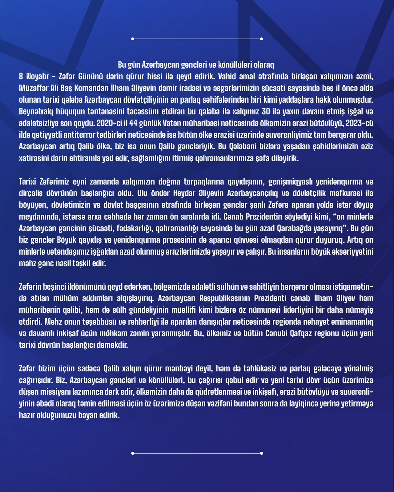 Bəyanatda qeyd olunub ki, tarixi Zəfərimiz eyni zamanda xalqımızın doğma torpaqlarına qayıdışının, genişmiqyaslı yenidənqurma və dirçəliş dövrünün başlanğıcı oldu. Ulu öndər Heydər Əliyevin Azərbaycançılıq və dövlətçilik məfkurəsi ilə böyüyən, dövlətimizin və dövlət başçısının ətrafında birləşən gənclər şanlı Zəfərə aparan yolda istər döyüş meydanında, istərsə arxa cəbhədə hər zaman ön sıralarda idi. Cənab Prezidentin söylədiyi kimi, “on minlərlə Azərbaycan gəncinin şücaəti, fədakarlığı, qəhrəmanlığı sayəsində bu gün azad Qarabağda yaşayırıq”. Bu gün biz gənclər Böyük qayıdış və yenidənqurma prosesinin də aparıcı qüvvəsi olmaqdan qürur duyuruq. Artıq on minlərlə vətəndaşımız işğaldan azad olunmuş ərazilərimizdə yaşayır və çalışır. Bu insanların böyük əksəriyyətini məhz gənc nəsil təşkil edir.