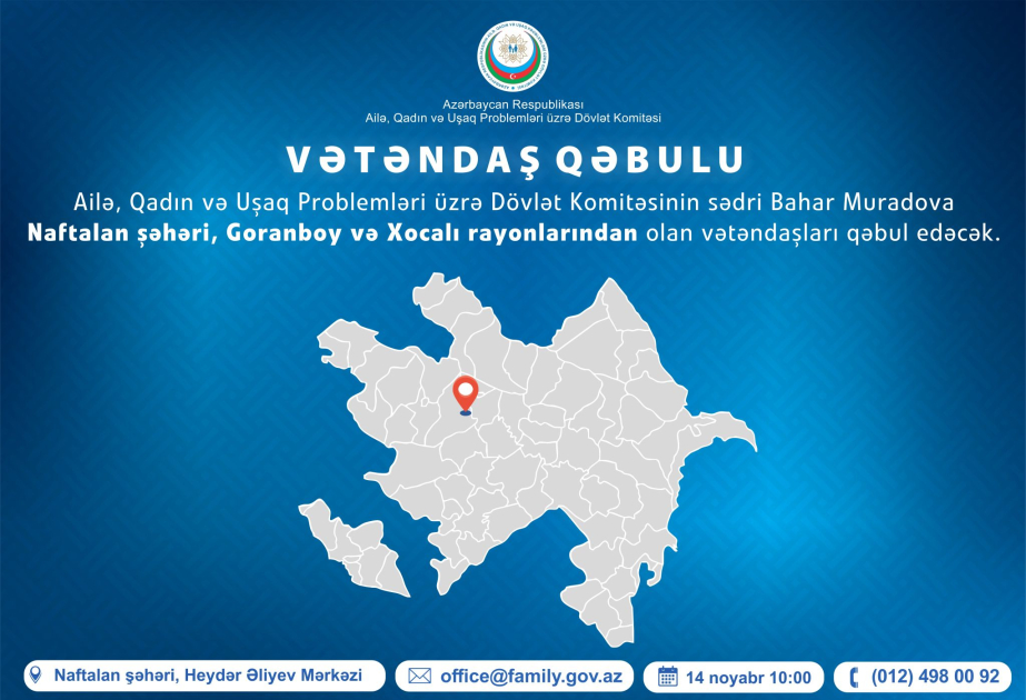 Ailə, Qadın və Uşaq Problemləri üzrə Dövlət Komitəsinin sədri Bahar Muradova noyabrın 14-də saat 10:00-da Naftalan şəhəri Heydər Əliyev Mərkəzində vətəndaşları qəbul edəcək. Dövlət Komitəsinin mətbuat xidmətindən SİA-ya verilən məlumata görə, qəbulda Naftalan şəhəri, Goranboy və Xocalı rayon sakinlərinin müraciətlərinə baxılacaq.