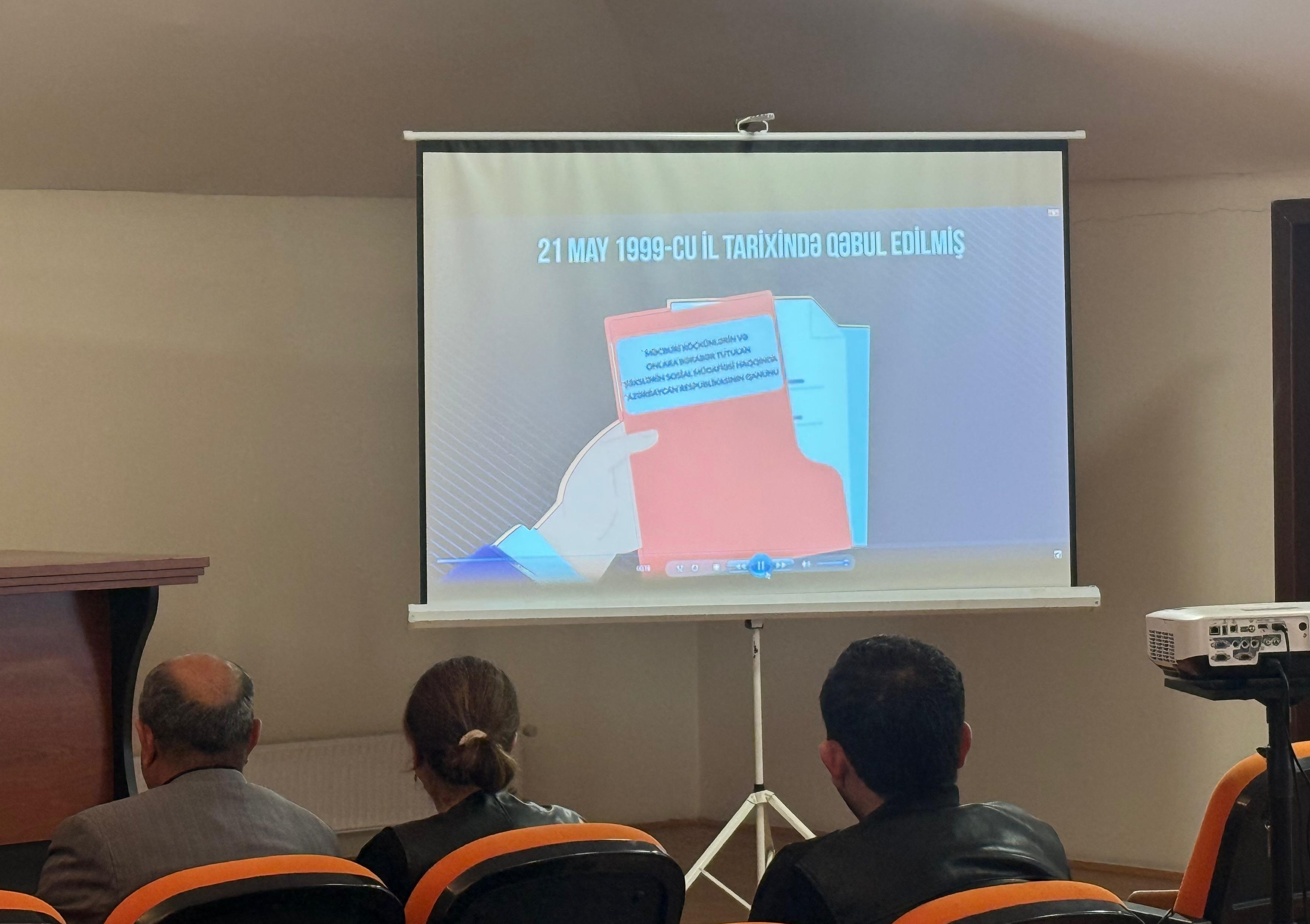 Qeyd edilib ki, Dövlət Komitəsində keçirilən tədbirdə məcburi köçkünlərin sosial müdafiəsi məsələləri və vahid aylıq müavinətin daimi yaşayış yerinə geri qayıtmış şəxslərin üç il müddəti başa çatdıqdan sonra dayandırılacağı və mina təhlükəsi haqqında hazırlanmış videoçarxlar məcburi köçkünlər üçün nümayiş etdirilib.