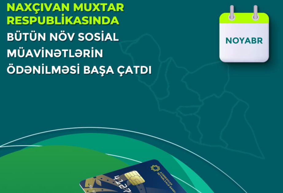 Naxçıvan Muxtar Respublikası Əmək və Əhalinin Sosial Müdafiəsi Nazirliyinin tabeliyində Dövlət Sosial Müdafiə Fondu tərəfindən muxtar respublika üzrə noyabr ayı üçün sosial müavinət, təqaüd, kompensasiya və ünvanlı dövlət sosial yardım ödənişləri başa çatdırılıb.