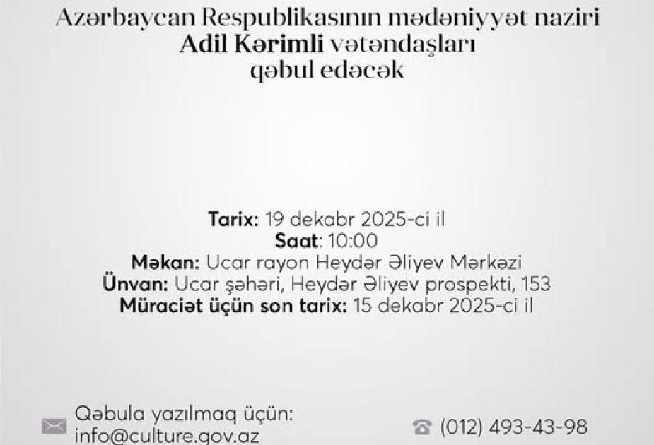 Mərkəzi icra hakimiyyəti orqanları və digər idarəetmə qurumlarının rəhbərlərinin şəhər və rayonlarda vətəndaşların qəbulu cədvəlinə əsasən mədəniyyət naziri Adil Kərimli dekabrın 19-da, saat 10:00-da Ucar rayon Heydər Əliyev Mərkəzində (ünvan: Ucar şəhəri, Heydər Əliyev prospekti, 153) Ucar, Zərdab, Yevlax, Mingəçevir, Ağdaş, Göyçay və Kürdəmir rayonlarından olan vətəndaşların müraciətini dinləyəcək. Bu barədə SİA-ya Mədəniyyət Nazirliyindən məlumat verilib.