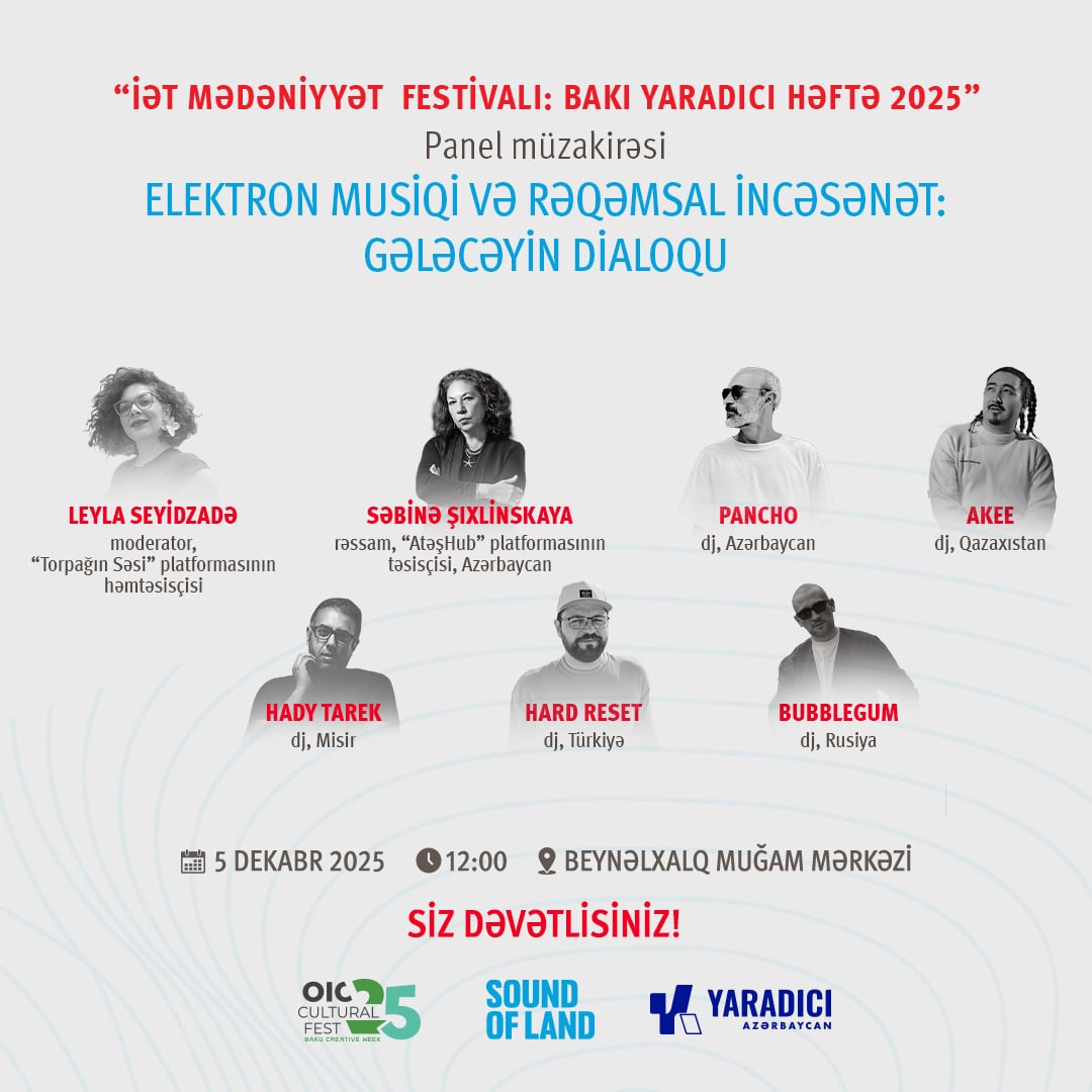 5 dekabr tarixində layihə çərçivəsində tanınmış beynəlxalq DJ-lərin və rəssam Səbinə Şıxlinskayanın iştirakı ilə panel müzakirə keçiriləcək. Səbinə xanım — Azərbaycanın tanınmış rəssamı, küratoru və AtəşHub platformasının yaradıcısıdır. Bu platforma müxtəlif istiqamətlərdə fəaliyyət göstərən istedadlı gəncləri birləşdirir və müasir incəsənətin inkişafı üçün yaradıcı bir məkan yaradır. Paneldə iştirakçılar elektron musiqi və rəqəmsal incəsənətin türk dünyasında yeni nəsillər arasında mədəni dialoqun formalaşmasında oynadığı rolu müzakirə edəcəklər. 5 və 6 dekabr tarixlərində Bakı şəhərindəki beş fərqli məkanda tanınmış DJ-lərin çıxışları baş tutacaq: – DJ AKEE (Qazaxıstan) — mədəniyyət xadimi, radio aparıcısı və musiqi prodüseri; – DJ Bubblegum (Tatarıstan) — Scratch DJ School Kazan-ın təsisçisi və Ak Bars komandasının rəsmi DJ-i; – Hady Tarek (Misir) — beynəlxalq səviyyədə tanınan prodüser və səsyazma mühəndisi; – Hard Reset (Türkiyə) — prodüser, DJ və A&R, qlobal səhnədə fəaliyyəti ilə seçilən sənətçi; – DJ Pancho (Azərbaycan) — ölkənin ən böyük vinil kolleksiyasına malik DJ, “Vinyl Lust” icmasının yaradıcısı. “Torpağın Səsi” — musiqi, rəqəmsal incəsənət və texnologiyanın birləşdiyi, mədəniyyətlər arasında sərhədləri aradan qaldıran yeni hərəkatdır.