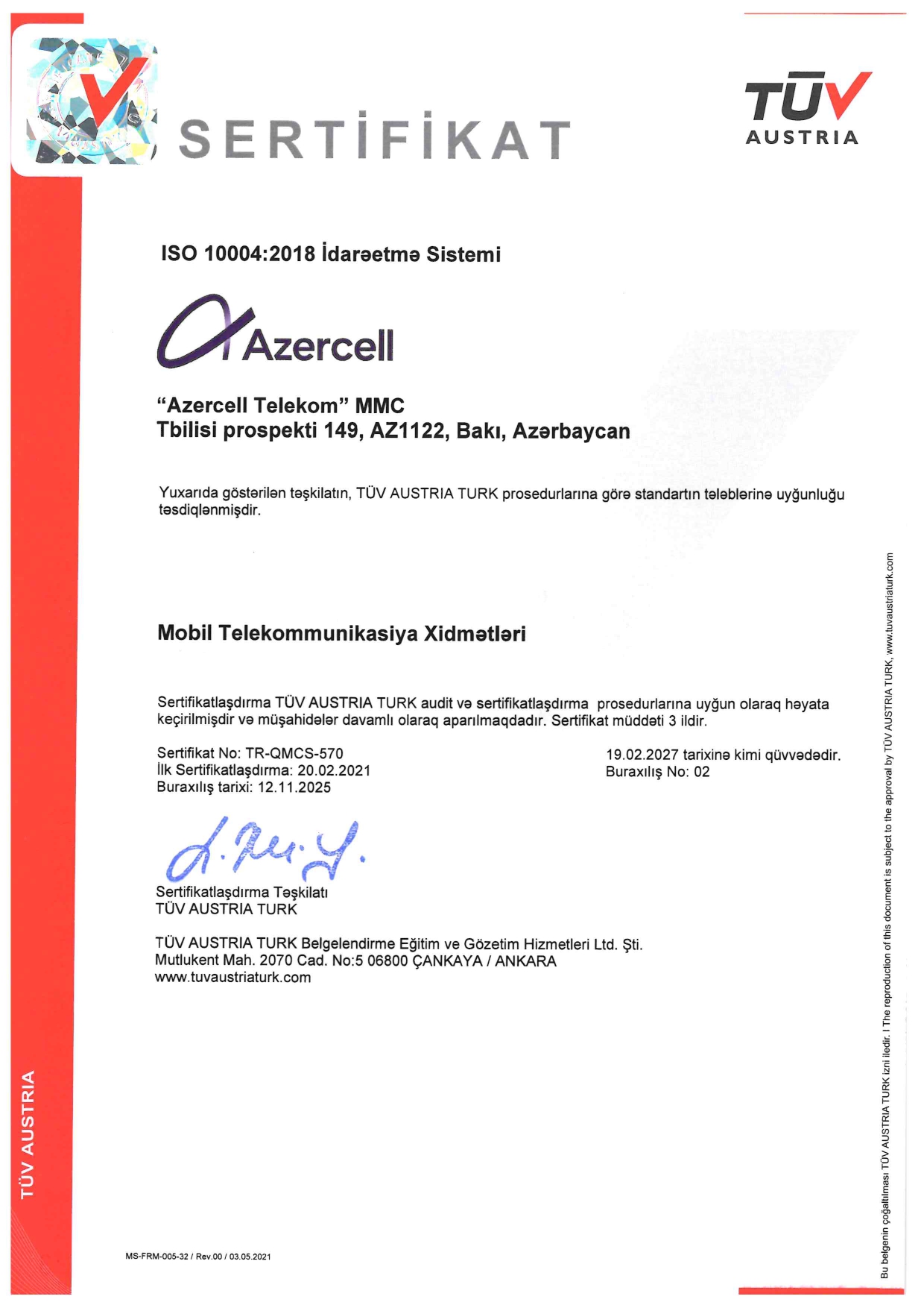 Dəyərləndirmə zamanı Azercell-in müştəri məmnuniyyətini daim diqqət mərkəzində saxladığı, müştəriyönümlü yanaşması və xidmət keyfiyyətinə sadiqliyi bir daha təsdiqlənib. Sertifikatlaşdırma prosesi “TÜV Austria Azərbaycan” MMC tərəfindən həyata keçirilib.