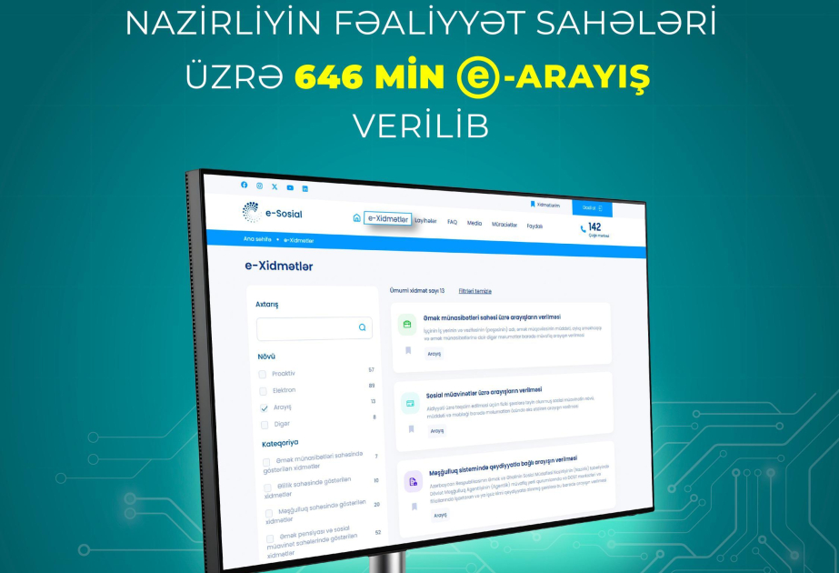 Nazirliyin İctimaiyyətlə əlaqələr şöbəsindən SİA-ya verilən məlumata görə, son illər əmək, məşğulluq, sosial təminat, əlillik, reabilitasiya və digər sahələr üzrə geniş elektronlaşma proqramı çərçivəsində bir çox e-arayış xidmətləri yaradılıb.