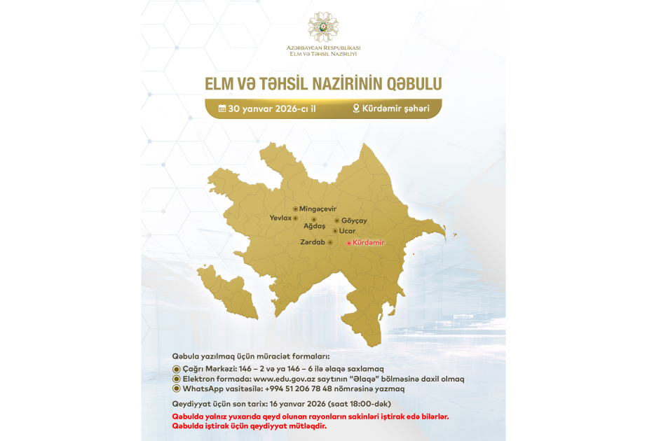 Elm və Təhsil Nazirliyindən SİA-ya bildirilib ki, qəbulda Kürdəmir, Mingəçevir, Yevlax, Ağdaş, Göyçay, Ucar, Zərdab sakinləri iştirak edə bilərlər.