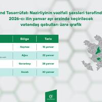 Kənd Təsərrüfatı Nazirliyinin vəzifəli şəxsləri tərəfindən 2026-cı ilin yanvar ayı ərzində keçiriləcək vətəndaş qəbulları üzrə qrafiki təqdim edirik.