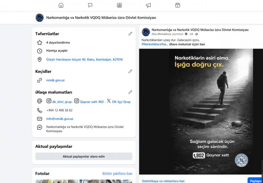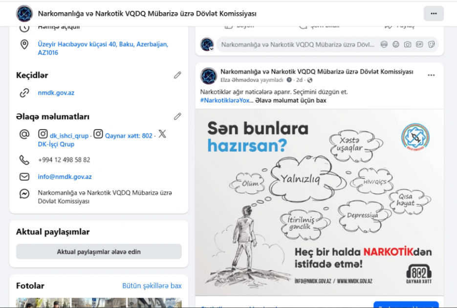 "Narkotik vasitələrin, psixotrop maddələrin və onların prekursorlarının qanunsuz dövriyyəsinə və narkomanlığa qarşı mübarizəyə dair 2025-2030-cu illər üçün Dövlət Proqramı”nın Tədbirlər Planının 8.4.10-cu yarımbəndininin icrası ilə əlaqədar antinarkotik təbliğatı işlərinin sosial şəbəkələr üzərindən aparılması məqsədilə müxtəlif həştəqlərlə sosial aksiyaların həyata keçirilməsi məqsədilə Narkomanlığa və Narkotik Vasitələrin Qanunsuz Dövriyyəsinə Qarşı Mübarizə üzrə Dövlət Komissiyasının daimi fəaliyyət göstərən İşçi Qrupu tərəfindən hazırlanmış müxtəlif maarifləndirici materiallar sosial şəbəkə platformalarında paylaşılıb.