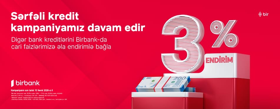 Birbank-ın digər banklarda kredit öhdəliyi olan müştərilər üçün sərfəli kampaniyasının müddəti uzadıldı. Belə ki, indi digər banklardakı kreditlərini Birbank-a gətirən hər kəs təyin olunan kredit faizinə 3% endirim qazanır. Artıq minlərlə istifadəçi bu fürsəti dəyərləndirib. Siz dəçətin maliyyə hesabatlarını aparmadan, büdcəsıxıntısı çəkmədən sərfəli kredit axtarışındasınızsa bu təklifi mütləq dəyərləndirin.