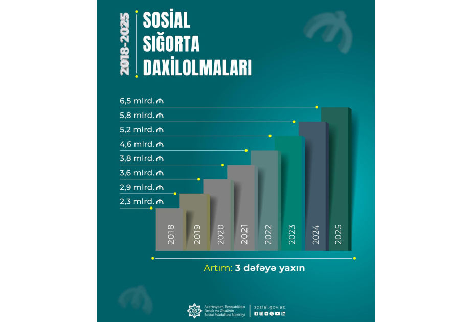 2018-2025-ci illərdə Fonda daxil olan sosial sığorta haqları üzrə illik vəsait 3 dəfəyə yaxın artaraq 2,3 milyard manatdan 6,5 milyard manata çatıb.