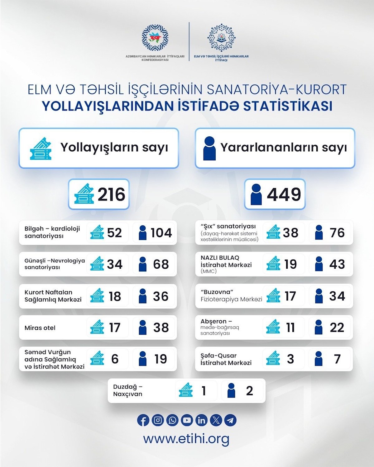 Belə ki, ümumilikdə 216 nəfər təhsil işçisi yollayışla təmin olunub, 449 nəfər isə ailə üzvləri ilə birlikdə Azərbaycan Həmkarlar İttifaqları Konfederasiyasının nəzdində fəaliyyət göstərən sanatoriya və müalicə mərkəzlərində istirahət edib.