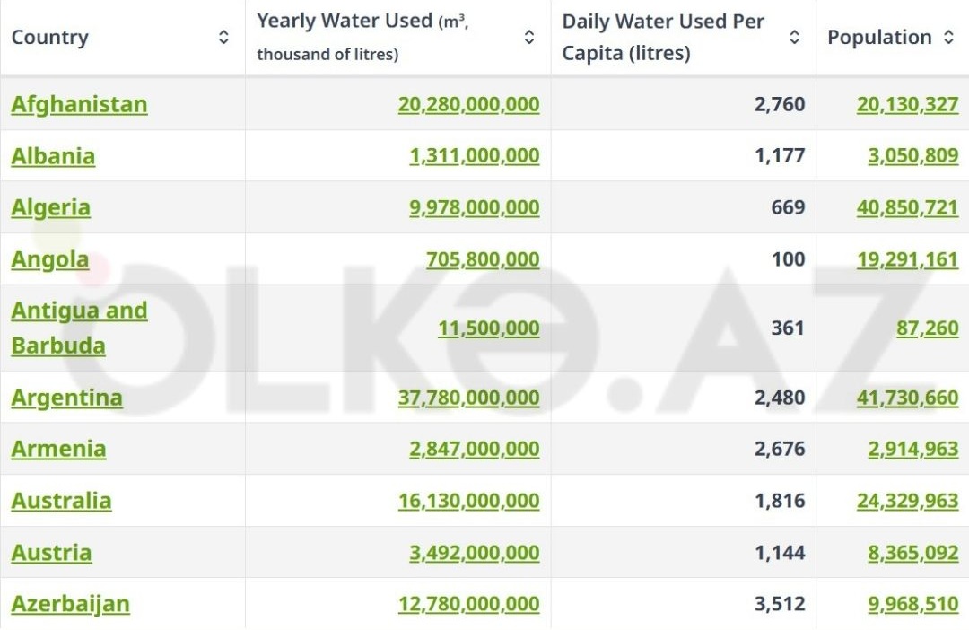 Azərbaycanda illik su istifadəsi 12.8 milyard kubmetr təşkil edir. Məlumata görə, adambaşına gündəlik 3512 litr su istifadə edilir. Maraqlıdır ki, platformada Azərbaycan əhalisinin sayına nəzər saldıqda rəqəmlərin əvvəlki illərə (2017-2018) aid olduğu görünür.