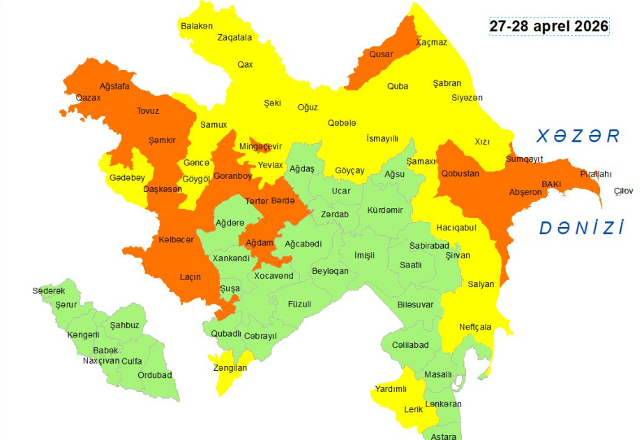 Milli Hidrometeorologiya Xidməti aprelin 27-28-də Bakıda və Abşeron yarımadasında, eyni zamanda bəzi bölgələrdə gözlənilən küləkli hava şəraiti ilə bağlı sarı və narıncı xəbərdarlıq edib.