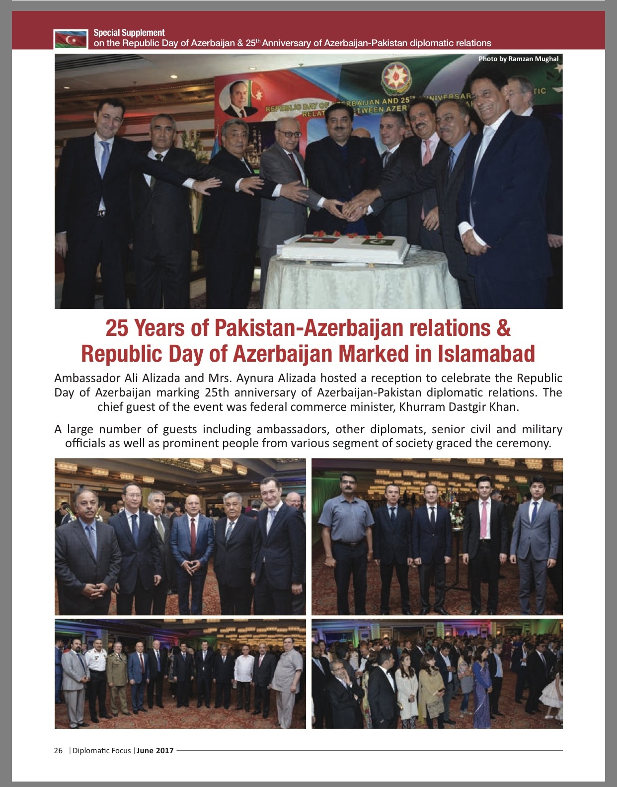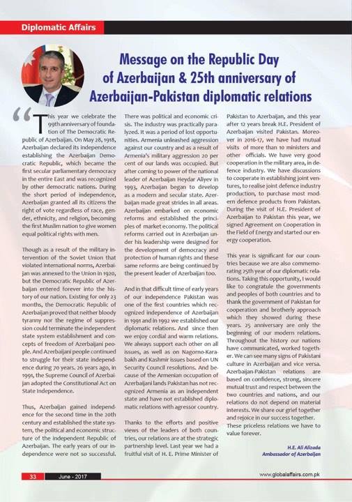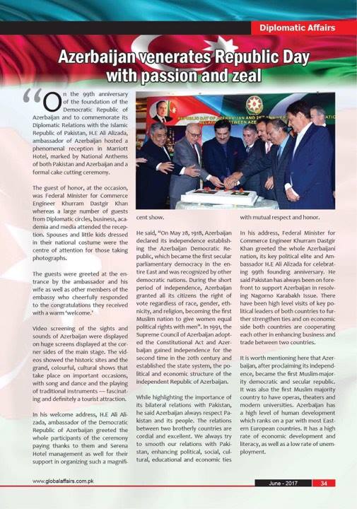 Pakistanın “Diplomatic Focus”, “Global Affairs” jurnalları və müəyyən digər mətbuat orqanlarının nəşrlərində Azərbaycana aid xüsusi materiallar dərc olunub. SİA-nın verdiyi məlumata görə, Azərbaycan-Pakistan diplomatik münasibətlərinin 25 illiyi ilə və 28 may Respublika günü münasibətilə Pakistanın “Diplomatic Focus”, “Global Affairs” jurnallarında, bu furnalların və müəyyən digər mətbuat orqanlarının elektron səhifələrində dərc olunan məqalələrdə Azərbaycan dövlətçiliyinin tarixi-siyasi təşəkkülü, erməni təcavüzü, ölkənin iqtisadi və turizm potensialı, eyni zamanda Azərbaycan Prezidenti tərəfindən 2017-ci ilin Azərbaycanda İslam Həmrəyliyi İli elan edilməsi ilə bağlı barədə materiallar öz əksini tapmışdır.