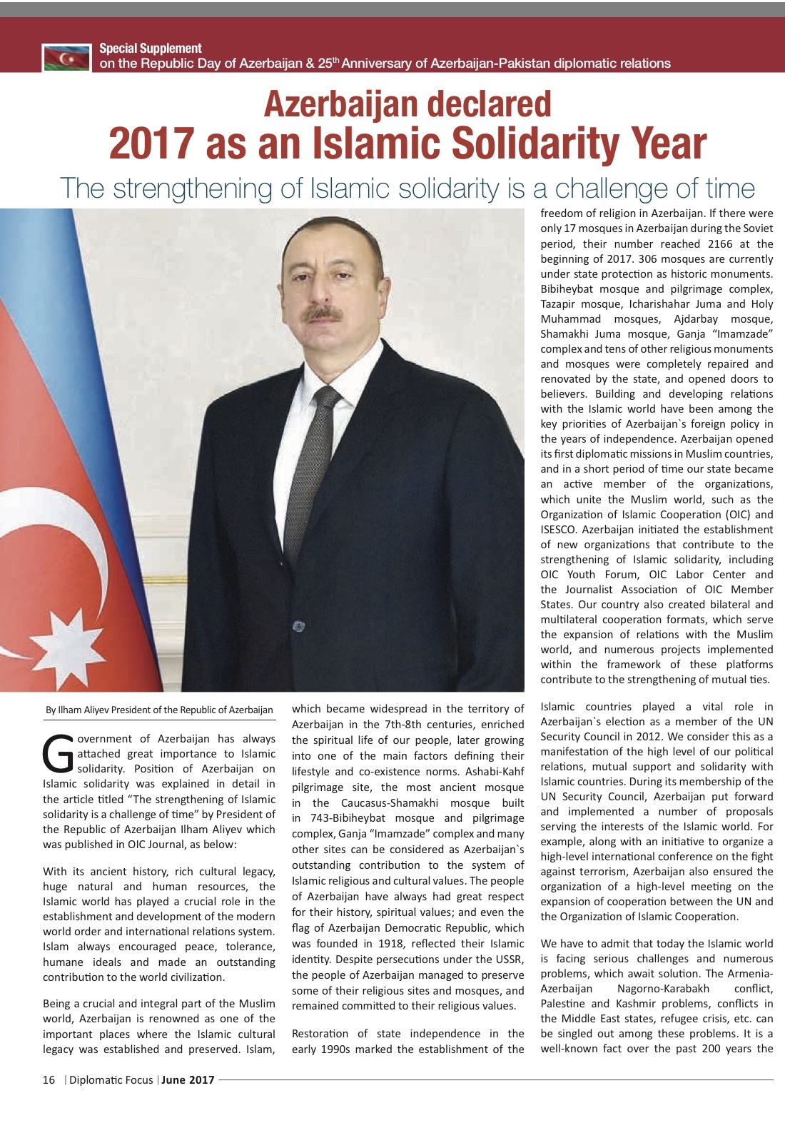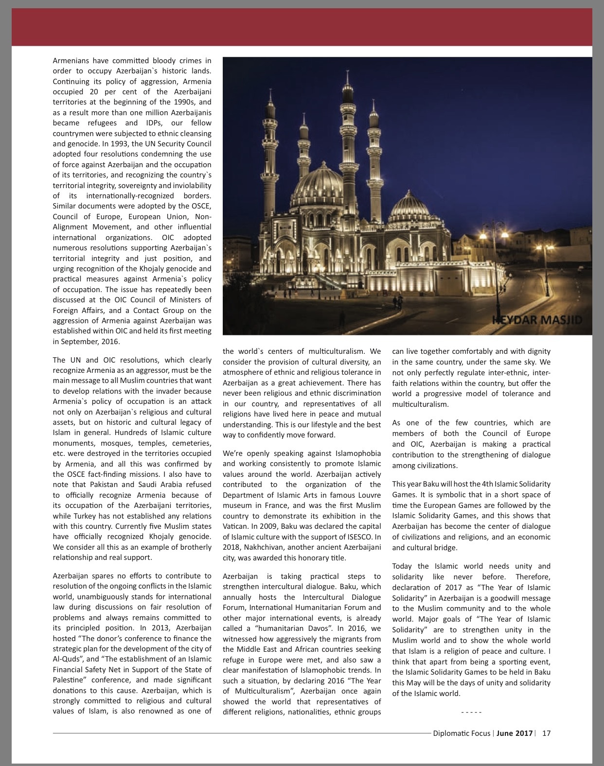 Məqalədə Azərbaycanda İslam dəyərlərinin, həmçinin İslam mədəniyyət nümunələrinin mühafizəsi, eyni zamanda İslam həmrəylinin təmini istiqamətində həyata keçirdiyi tədbirlər Azərbaycan prezidentinin “OİC Journal” jurnalına istinadla, ətraflı izah edilmişdir. Bildirilmişdir ki, Bibiheybət, Təzəpir, İçəriçəhər, Cuma, Müqəddəs Məhəmməd, Əjdərbəy, Şamaxı Cuma, Gəncə İmamzadə məscidləri, Naxçıvandakı Əshabi-Kəhf ziyarətgahı kimi İslam abidələrinin qorunmuş, müstəqilliyini qazandıqdan sonra ölkədə minlərlə məscid tikilmişdir. Azərbaycan ilk səfirliklərini müsəlman ölkələrində açmış, bu gün də İslam dünyasını birləşdirən İƏT və İSESCO təşkilatlarının işində fəal iştirak etməkdədir. İslam ölkələri Azərbaycanın 2012-ci ildə BMT Təhlükəsizlik Şurasının üzvü seçilməsində həlledici rol oynamışdır. İƏT Ermənistanın Azərbaycana qarşı təcavüzünü birmənalı məhkum edən təşkilat olmuşdur. Pakistan və S. Ərəbistanı Ermənistanı dövlət kimi tanımamış, Türkiyə isə onunla diplomatik əlaqələr qurmaqdan imtina etmişdir. Azərbaycan Prezidentinin sərəncamı ilə 2017-ci il “İslam Həmrəyliyi İli” elan edilmişdir. 2017-ci ilin mayında Bakıda 54 İslam ölkəsinin atletlərinin iştirakı ilə 4-cü İslam Həmrəyliyi oyunları keçirilmişdir. Məqalədə qeyd olunmuşdur ki, İƏT və Avropa Şurasının üzvü kimi Azərbaycan Qərblə İslam dünyası arasında mədəniyyətlərarası dialoqun təsisinə öz töhfəsini vermək əzmindədir.